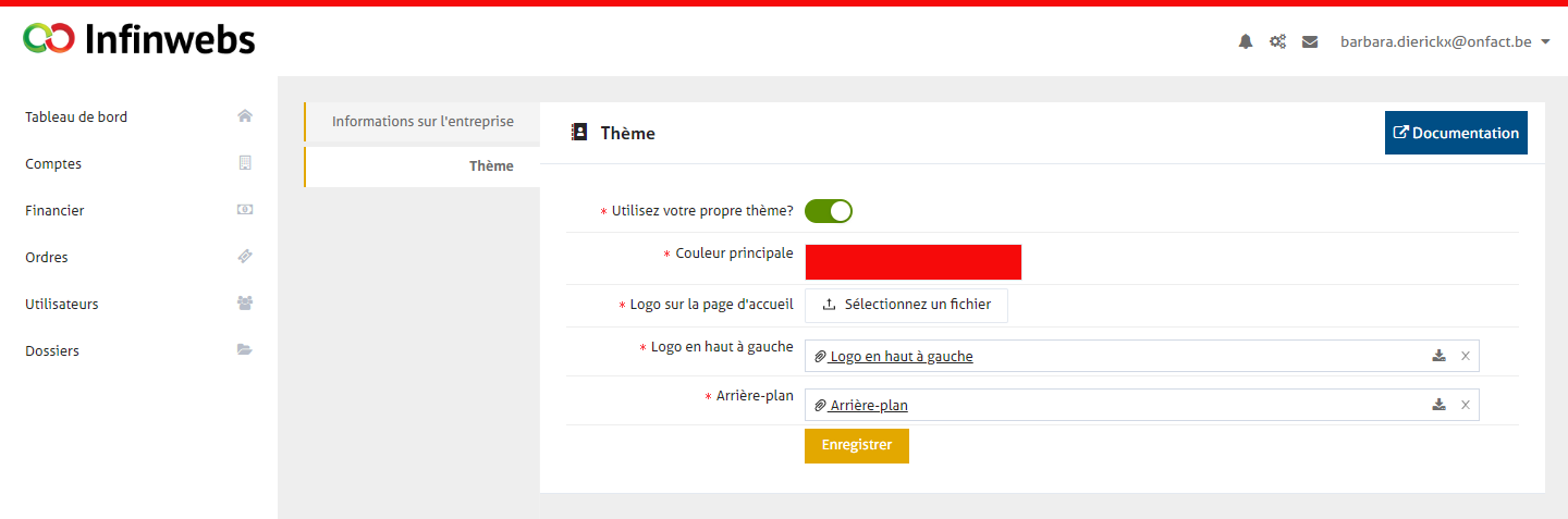 Si vous avez votre propre page de bureau enFact, les paramètres seront ici et le curseur à "Utiliser votre propre thème" sera actif (= vert). Que pouvez-vous modifier à cet endroit ?